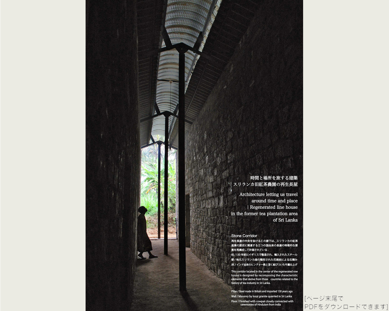 展示では、自分の建築観の芯にある「建築にできることとは何か」という視点を、立体展示の「 体感型立体ダイアグラム 」と平面展示(パネル)によって表現した。展示のタイトルは「 時間と場所を旅する建築 」。スリランカ旧紅茶農園の長屋再生プロジェクトで感じ得たことをもとに制作した。ダイアグラムでは、スリランカで貧困化が進むセイロンティーの旧紅茶農園の「村」、再生の設計を行った移民労働者の「長屋」、そしてそこを訪れた時の「あなた」の関係を表現した。