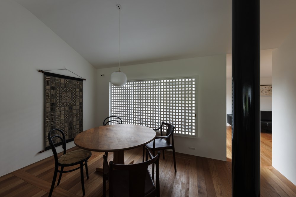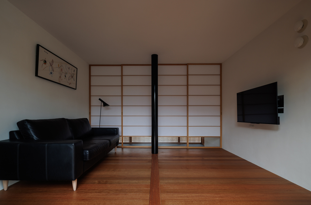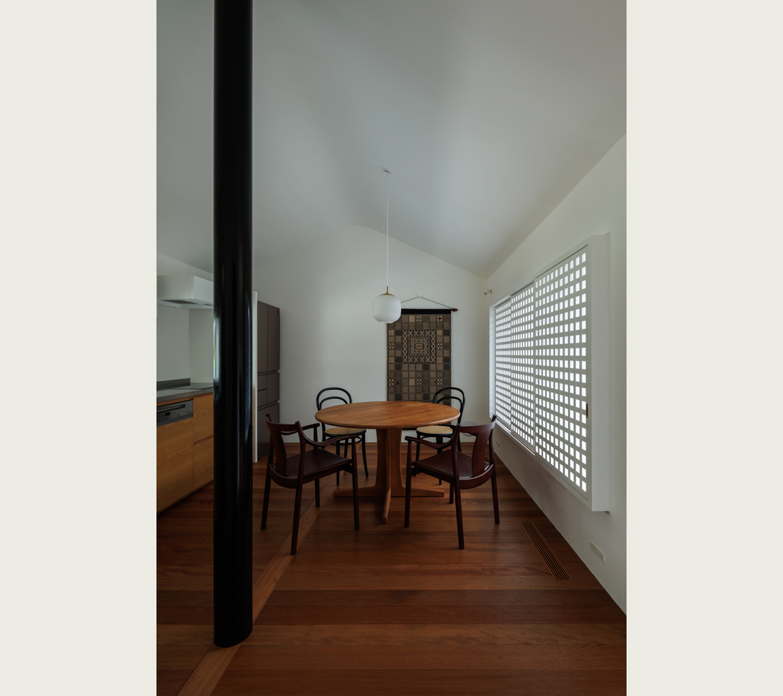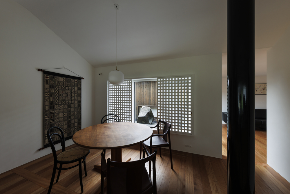 この家の柱は全て同じ径で、同じ漆黒に塗られたものが反復されている。黒は「虚」を意味する。漆黒の柱が描く中空構造の中心もまた「虚」である。この「虚」が描く仮構、すなわち眼前とは異なるもう一つの世界を家という日常空間の中に持つことが、人間が人間らしく生きるために必要だと考え、この計画を行った。