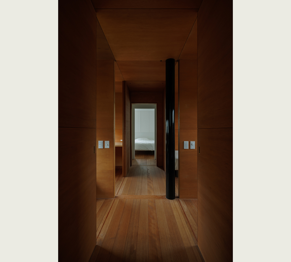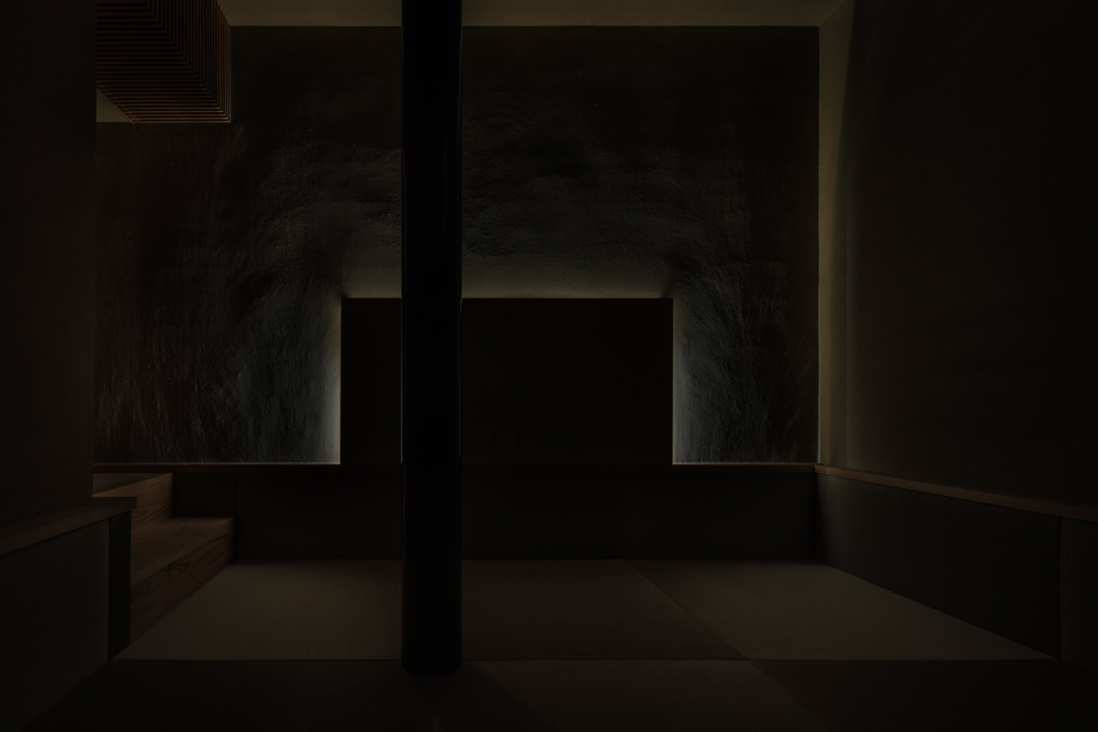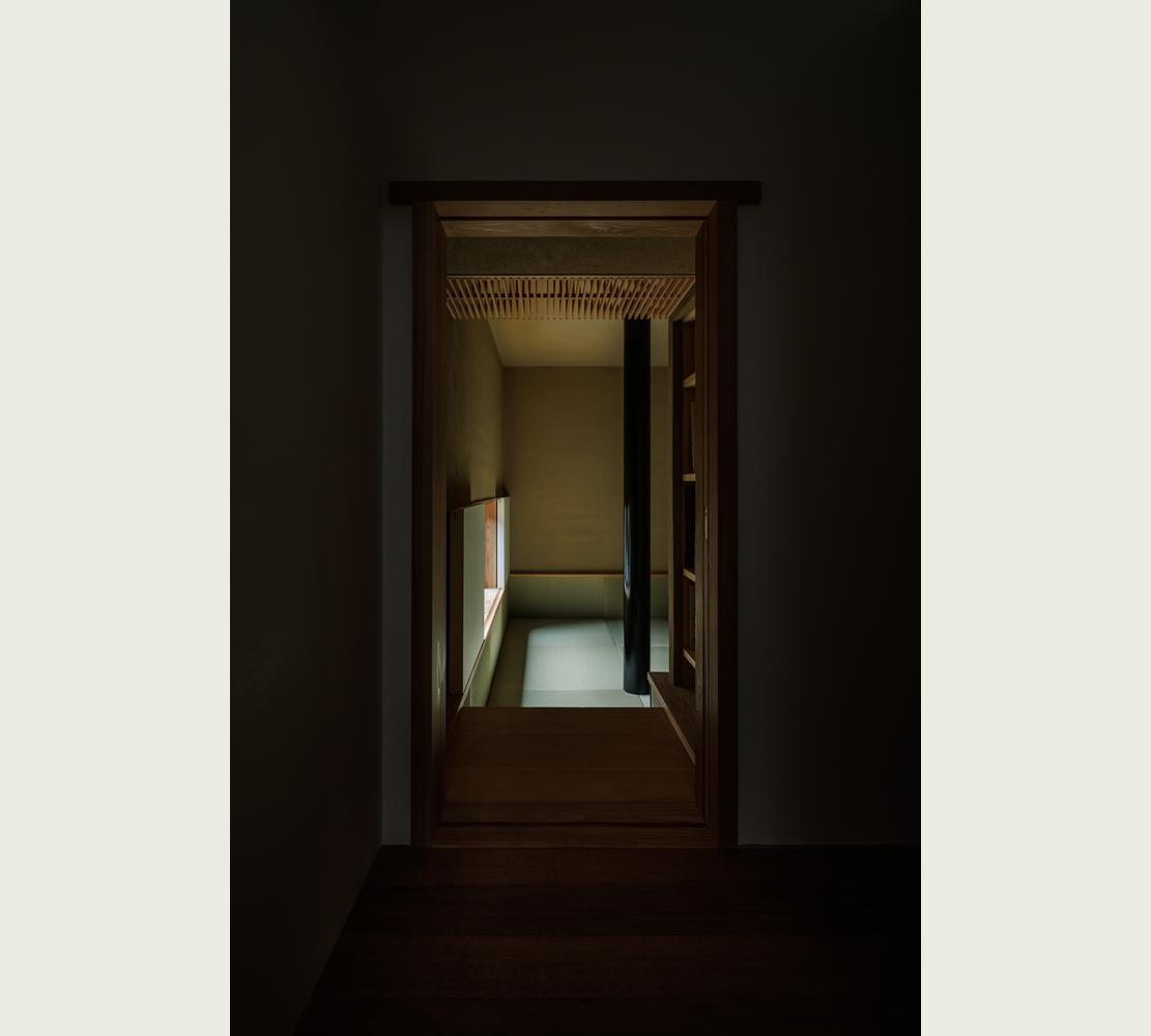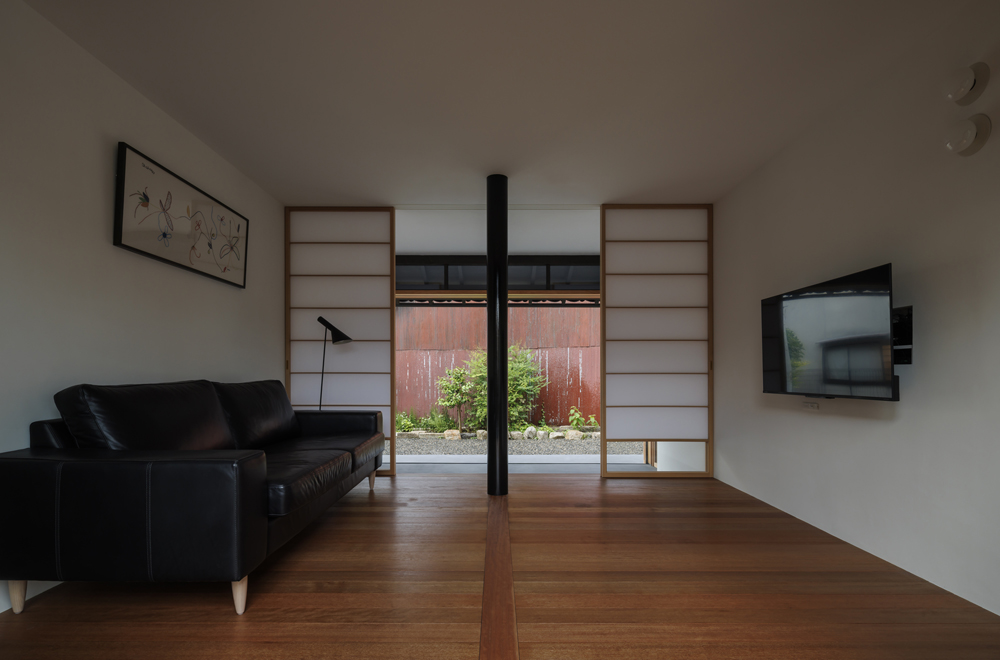 この家の柱は全て同じ径で、同じ漆黒に塗られたものが反復されている。黒は「虚」を意味する。漆黒の柱が描く中空構造の中心もまた「虚」である。この「虚」が描く仮構、すなわち眼前とは異なるもう一つの世界を家という日常空間の中に持つことが、人間が人間らしく生きるために必要だと考え、この計画を行った。