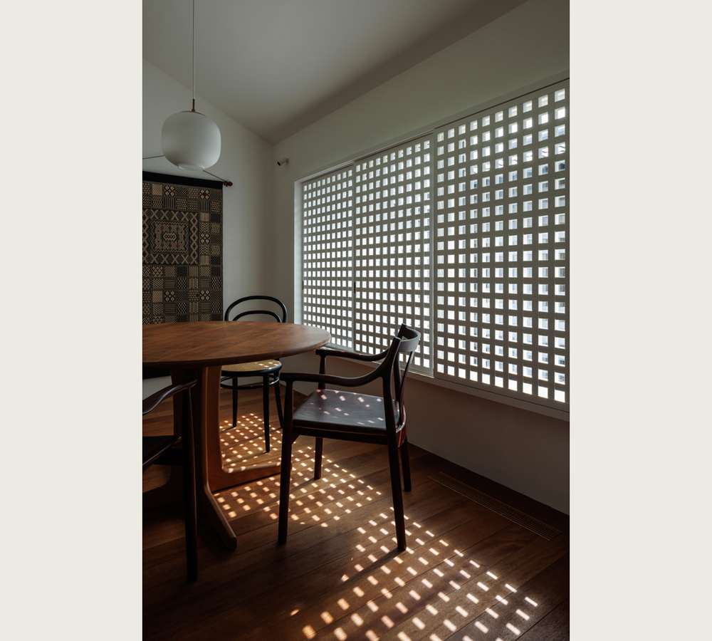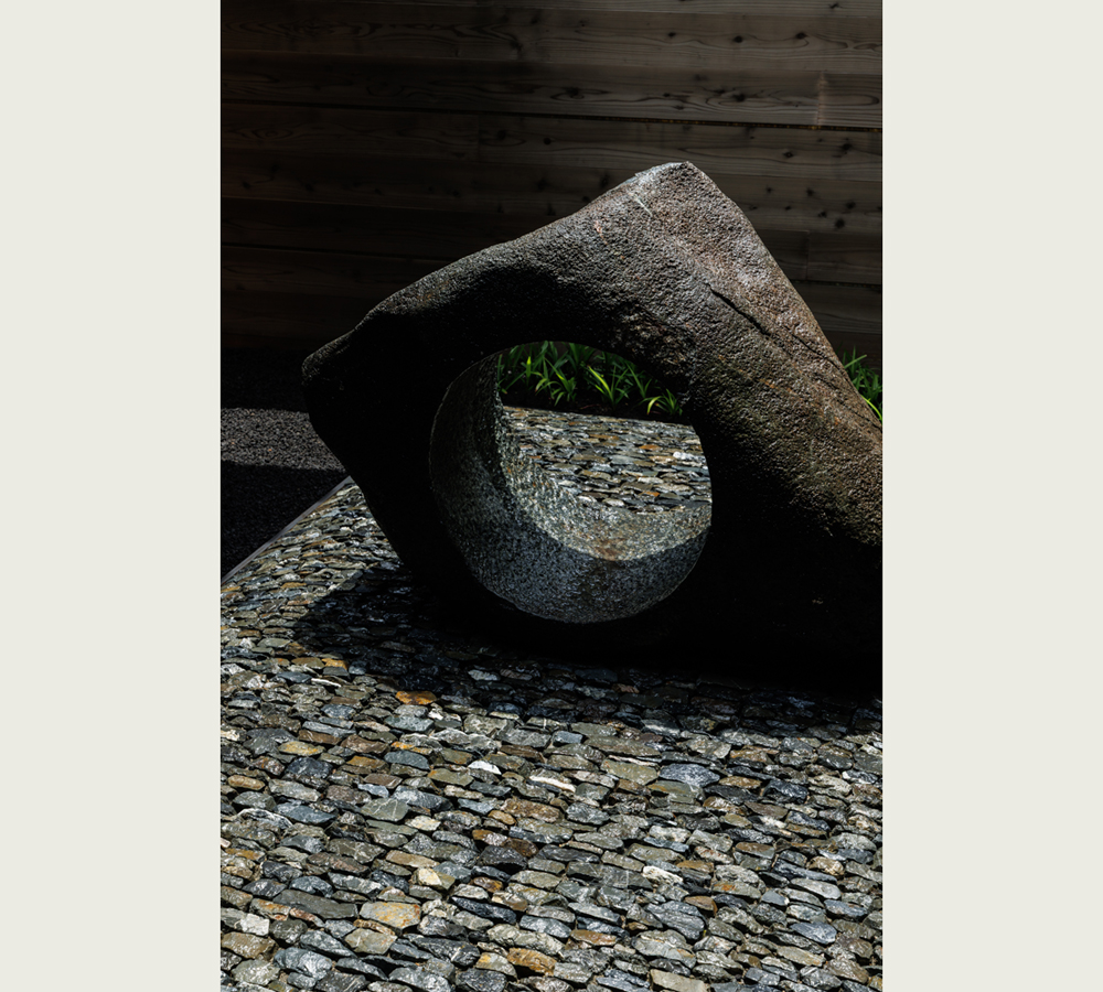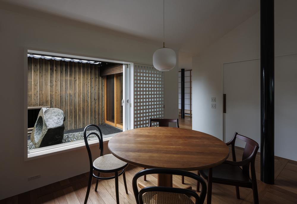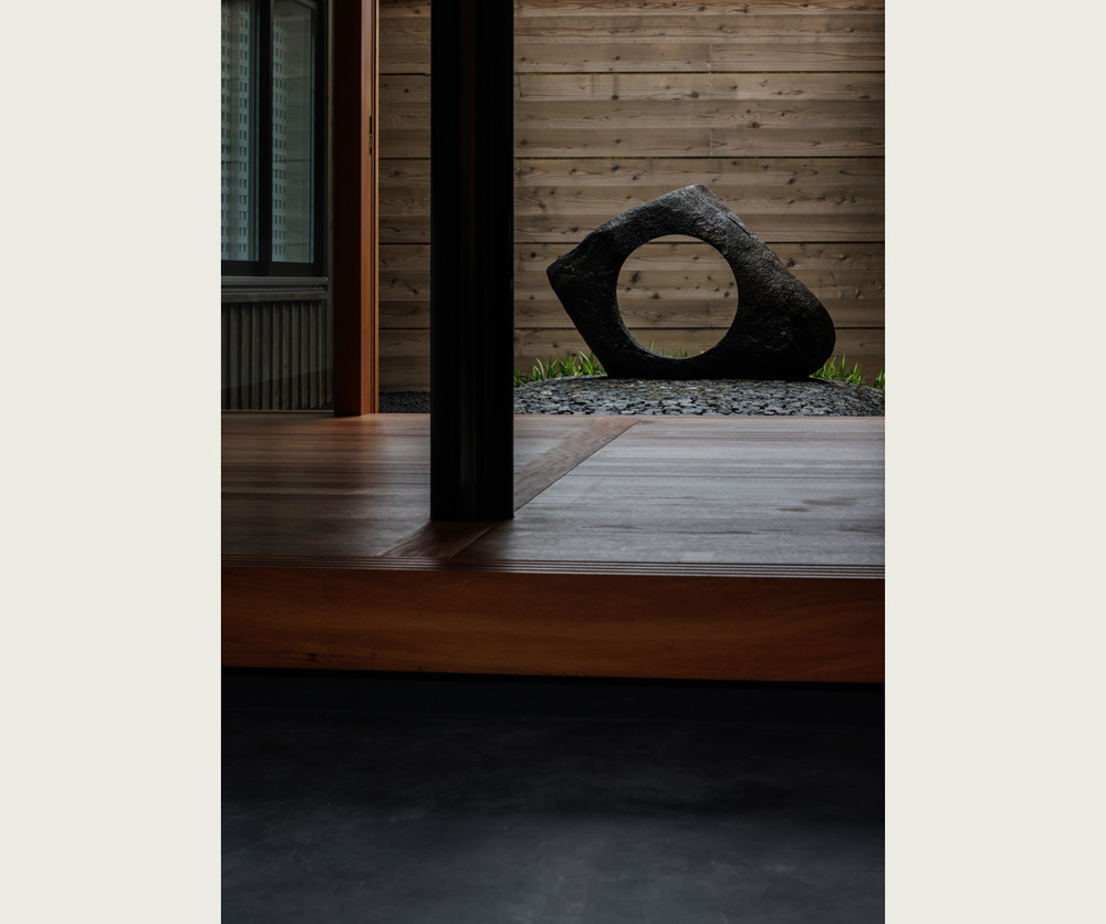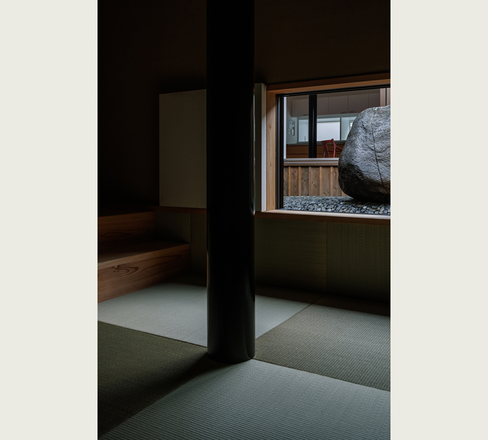 中庭の生駒石は家の奥であり、路地の奥でもある。ひいては都市の奥の1つでもあると考えている。その中央部は丸く穿かかれ、中空となっている。それは「奥」の消失点であり、人間の意識をさらに深い世界へと導く。散文詩的に立つ3本の柱は「奥」の中空を家の一部として共有している。それぞれの柱は各所で空間の軸となり、それらの均衡が保たれることで家全体の像を描く多中心の構造は、中央が空であり、中庭の中空構造と重なり合う。中心を持ち一つの統合に向かう空間と異なり、中空構造の空間は曖昧な輪郭が周囲と溶け合い、内部は周辺環境を受容し、周囲と近接するエアポケットのような場所に人間が棲み付くのを無意識の内に促してくれる。