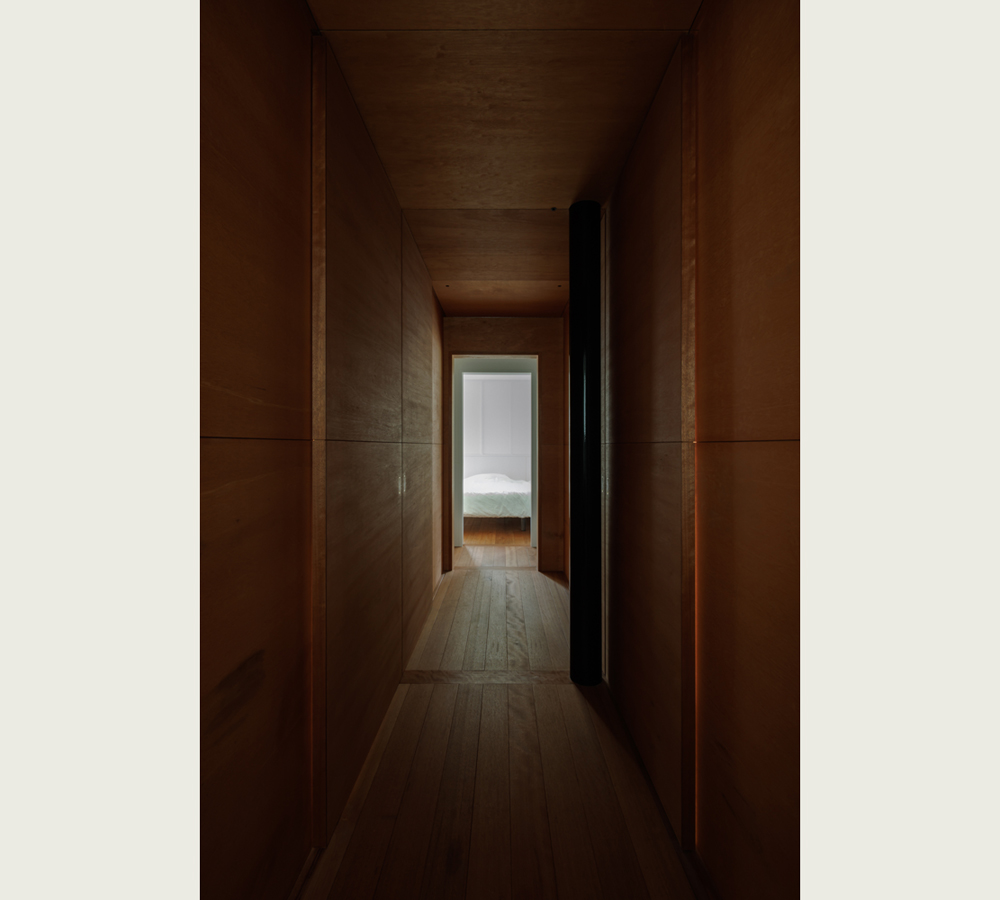 この家の柱は全て同じ径で、同じ漆黒に塗られたものが反復されている。黒は「虚」を意味する。漆黒の柱が描く中空構造の中心もまた「虚」である。これらの「虚」が描く仮構、すなわち眼前とは異なる〝もう一つの世界〟を家という日常空間の中にもつことが、人間が人間らしく生きるために必要だと考えこの計画を行った。